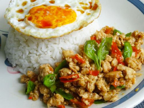 - ใส่ใบกระเพราลงไปผัด ให้หอม ปิดไฟ เสริฟใส่จานพร้อมรับประทาน จัดจานให้สวยงามด้วยแตงกวา และ ทานคู่กับ